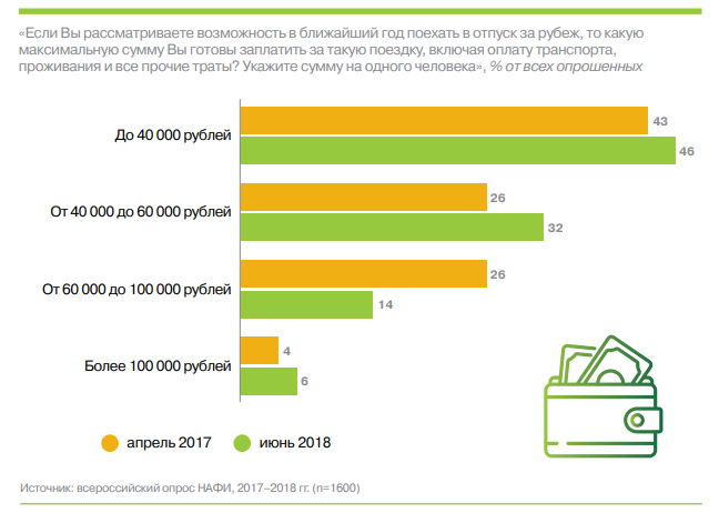 Выросло (32% против 24% в 2017 г.) число тех, кто готов выделить на зарубежный отдых от 40 тыс. р. до 60 тыс. р. Почти вдвое меньше, чем год назад (14% в 2018 году против 26% в 2017 г.) готовы потратить на будущий зарубежный отпуск от 60 до 100 тыс. р. При этом на треть – с 4% до 6% выросла доля тех, кто готов потратить на зарубежную поездку сумму свыше 100 тыс. р. на человека.