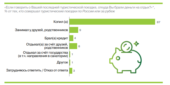В НАФИ выяснили, что большинство россиян самостоятельно копят деньги на отдых (87%). Каждый десятый занимает деньги у друзей или родственников (9%) или отдыхает за их счет (8%). Чаще так поступают молодые люди в возрасте от 18 до 24 лет (18% занимают средства у родственников или друзей, 20% отдыхают за счет средств других).