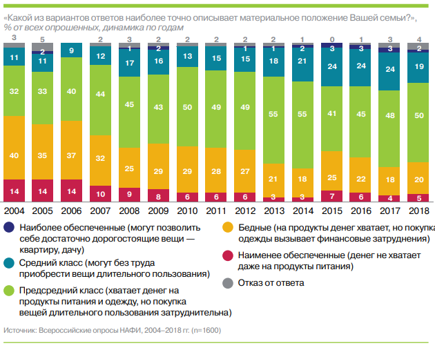 Самая же многочисленная группа населения в России – 50% по оценкам НАФИ – так называемый «предсредний» класс: собственных средств им хватает на продукты и одежду, но покупка таких товаров, как телевизор и мебель, для них затруднительна.