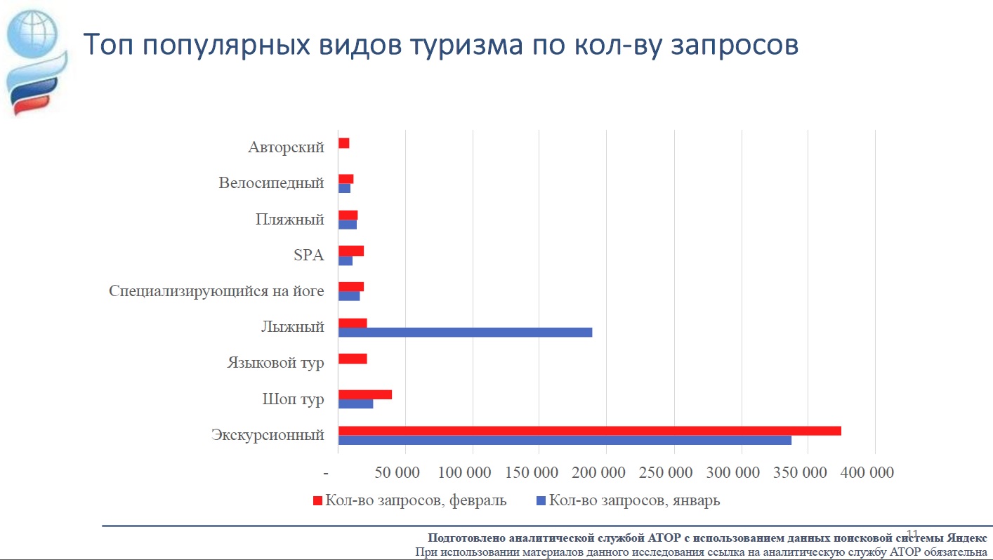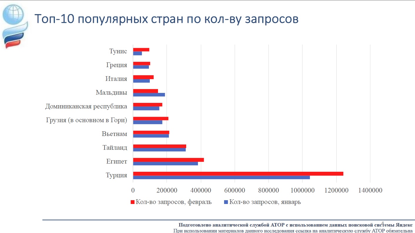 ТОП-10 самых популярных туроператорских брендов, которые запрашивали пользователи поисковой системы Яндекс в январе и феврале 2019 года состоит преимущественно из туроператоров-членов АТОР. Так, на первых двух местах расположились компании PEGAS Touristik и ANEX Tour, на четвертом – Coral Travel, и т.п.