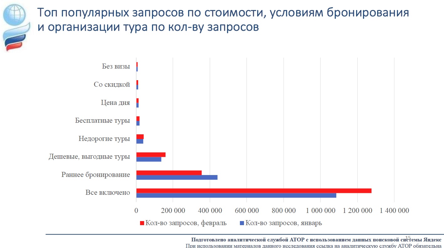 Аналитическая служба АТОР изучила поисковые запросы российских пользователей Яндекса на туры в феврале и январе. Исследовались запросы по направлениям, условиям туров, видам туризма, длительности туров, желаемому сезону и месяцу поездки. Ключевые выводы – в материале «Вестника АТОР».