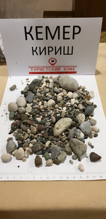Кемер, центральная часть. Плотный коричневого цвета песок, но его очень немного. В основном на пляже средняя и крупная галька. Причем галька не скучно однотонная, а окрашенная в разные цвета. Она бежевая, коричневая, светлая, изумрудная, полосатая, ярко-синяя, сероватая, что придаёт побережью своеобразный колорит.