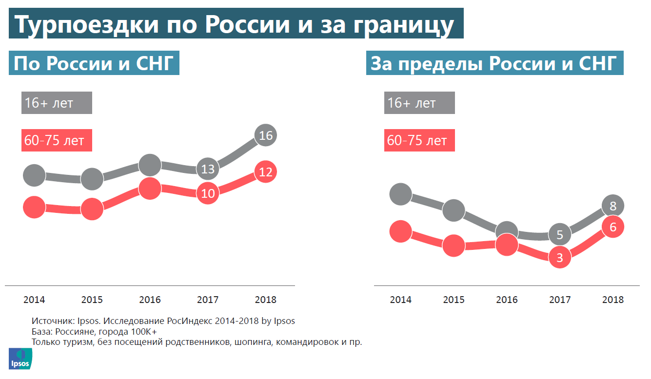 При этом пенсионеры ездят в турпоездки ожидаемо меньше, чем люди в более молодом возрасте: так, в 2018 году, по данным Ipsos, по России совершали турпоездки 16% опрошенных в возрасте 16-59 лет, за пределы России и СНГ – 8%.