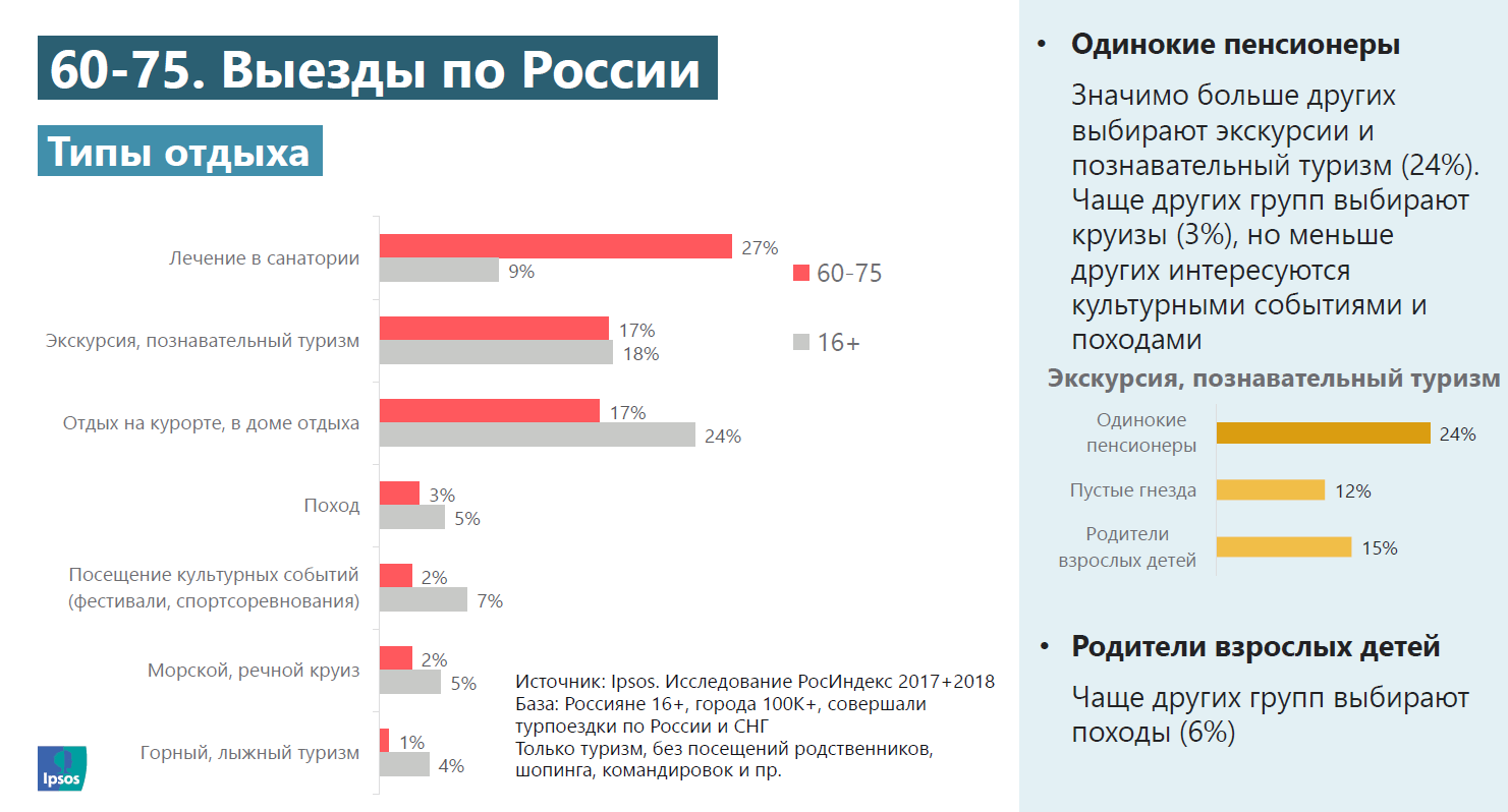 По данным Ipsos, среди пожилых людей в России (возрастная группа 60-75 лет, в исследовании участвовали жители городов с населением от 100 тыс. человек) выросла доля тех, кто включает путешествия в список 5 главных жизненных целей на предстоящий год. В 2018 году каждый пятый в этой возрастной группе хотел бы отправиться путешествовать в ближайшие 12 месяцев (с 2015 года доля таких людей выросла с 15% до 19%).