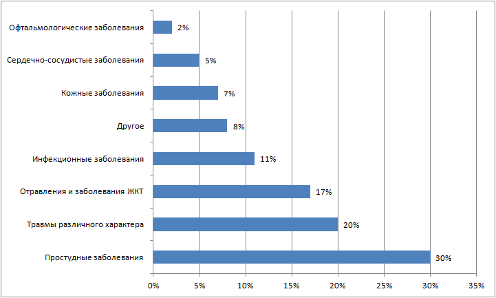 Примерное распределение причин обращения туристов за медицинской помощью на зарубежном отдыхе (на основе уточненных данных ERV по лету 2018 года) выглядит так, как на рисунке: