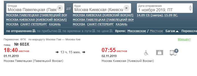 Это поезд 603 Ч – он будет отходить вечером в 20:30 с Киевского вокзала и прибывать утром следующего дня – в 09:41 на Павелецкий вокзал. А также встречный состав – поезд 603 X. Отходя с Павелецкого вокзала в 18:40 этот поезд будет прибывать на Киевский вокзал в 7:55 утра. Время в пути составит у первого поезда 13 часов 8 минут, у второго – 13 часов 15 минут.