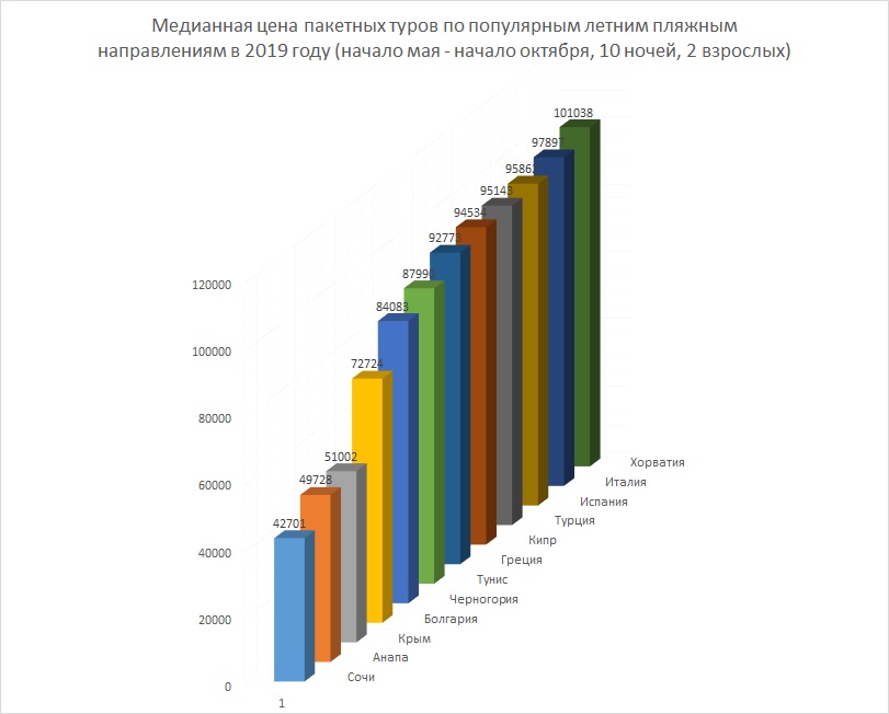Греция, Кипр, Турция, Испания в этом летнем сезоне держали планку средних цен на уровне 92,7 – 95,8 тыс. р. за 10 ночей на двоих. Наиболее же дорогими направлениями оказались в период с мая по октябрь 2019 года Италия и Хорватия (97,9 – 101 тыс. р. за десятидневный тур на двоих).