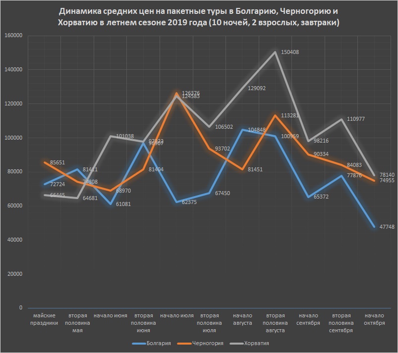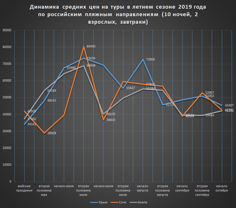 В течение летнего сезона (начиная с майских праздников и заканчивая началом октября) по разным массовым направлениям средние цены на пакетные туры менялись неодинаково. Спады и подъемы здесь зависели от степени загруженности отелей, активности спроса, наличия стимулирующих акций туроператоров и отельеров.