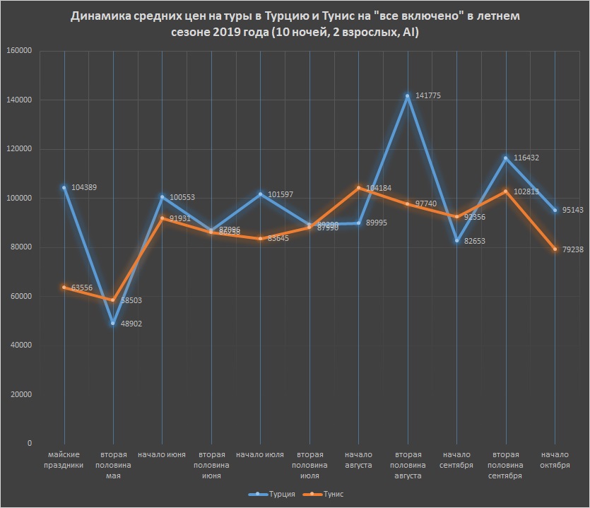Динамика цен на массовых выездных направлениях, где преобладает система «все включено» – в Турции и в Тунисе, представлена на рисунке ниже.