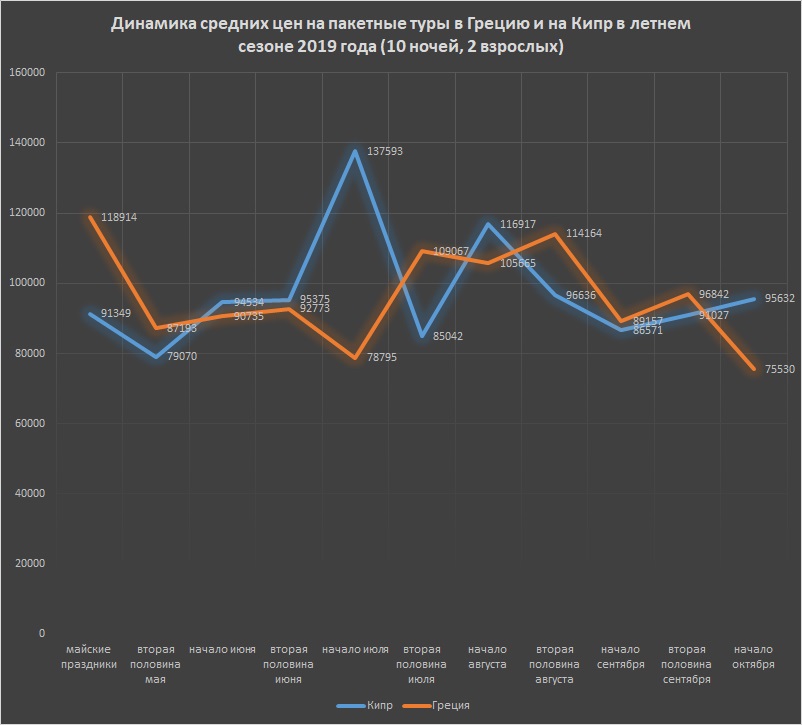 Греция и Кипр (рисунок ниже) во многом демонстрировали схожую динамику по средним ценам в летнем сезоне 2019 года – за исключением резкого расхождения в начале июля – Кипр здесь демонстрировал ценовой максимум, а Греция – наоборот.