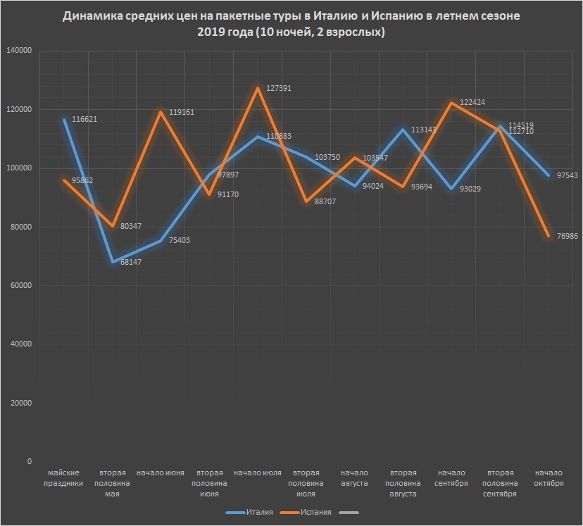 Наконец, Западное Средиземноморье – Испания и Италия. Здесь средние цены на десятидневные пакетные туры вели себя по-разному. Начало июня, июля и начало сентября – самые высокие цены по Испании, наибольшую выгоду здесь можно было получить, купив тур с заездом во второй половине мая, второй половине июня и июля, а также в конце сезона (в октябре).