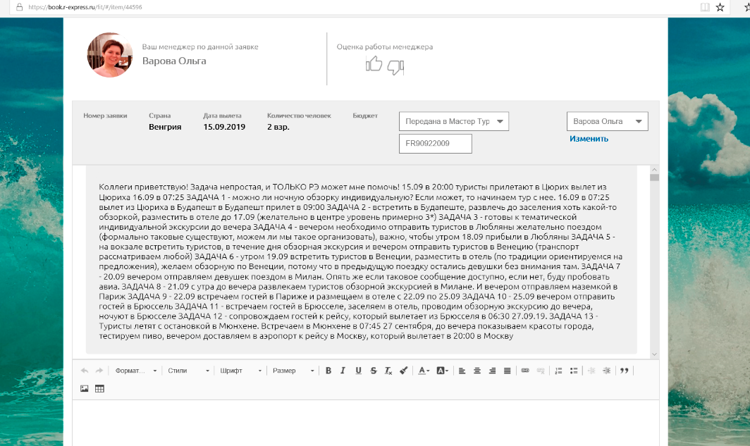 Главным нюансом запроса было то, что мы бронировали услуги и отели в городах, когда туристы были уже в поездке. То есть, когда туристы проживали в Будапеште, им бронировали отели и экскурсии в Милане. Когда они проживали в Милане, бронировали отели и экскурсии в Париже. Когда проживали в Париже – бронировали Брюссель и т.п.