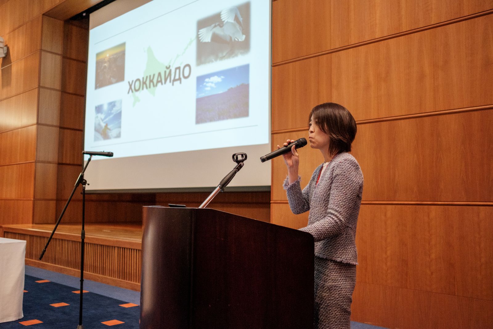 Айри Мотокура обратилась к гостям мероприятия с вопросом: «Наверное, вам интересно, почему вы должны лететь из Москвы на Хоккайдо целых девять часов, да и еще и с пересадками? Какой в этом смысл?».