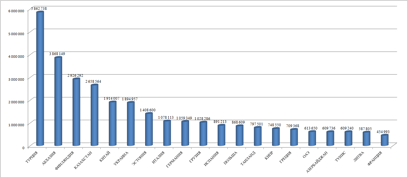 ТОП-10 стран выделяются: только они дают цифры выезда более 1 млн поездок за 9 месяцев. Это, по убыванию, Турция, Абхазия, Финляндия (2,926 млн), Казахстан (, Китай, Украина, Эстония, Италия, Германия и Грузия.