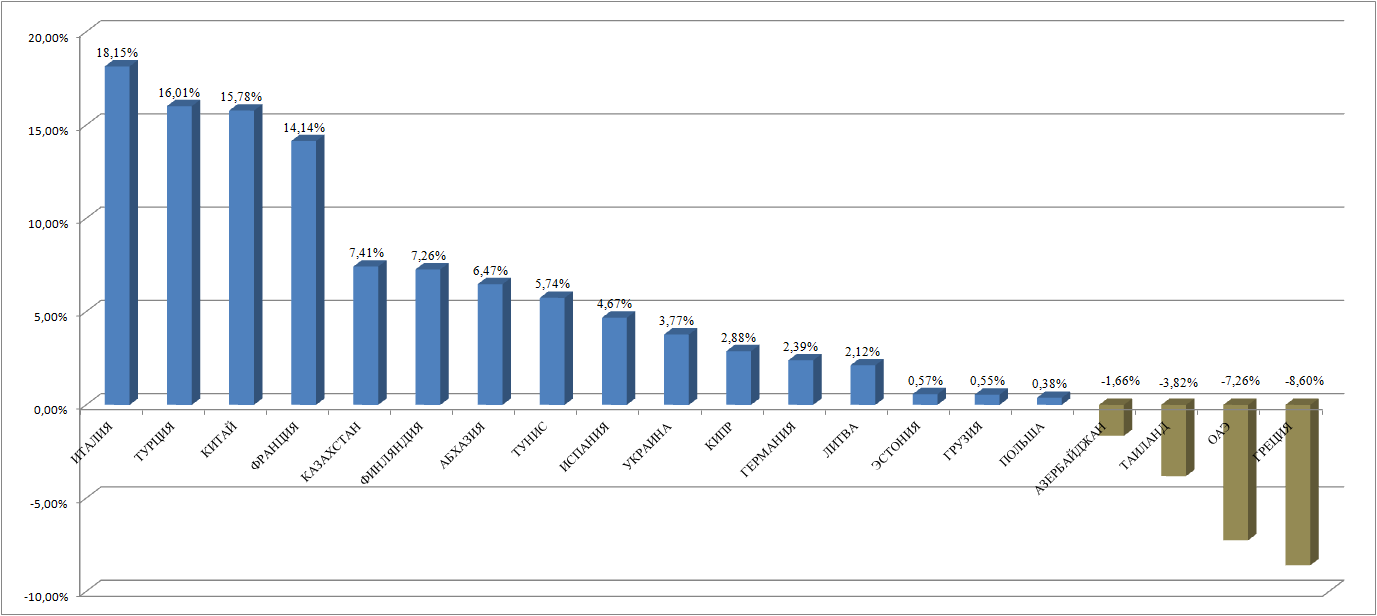 Динамика выездного потока в страны ведущей двадцатки была неравномерной. Наибольший прирост по отношению к аналогичному периоду прошлого года продемонстрировали Италия, Турция, Китай и Франция. Характерно, что три страны из этих четырех с Россией не граничат, а значит положительная динамика может быть в полной мере отнесена именно к туристическому потоку.