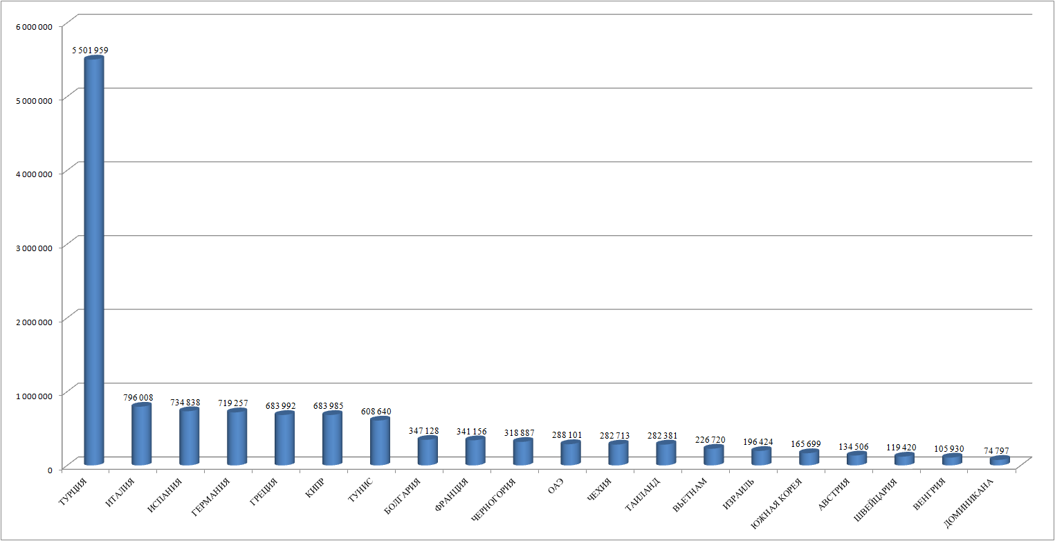 Рис. 3. Двадцатка стран-лидеров «дальнего» зарубежья по объему выездного туристического потока в летнем сезоне 2019 года (II и III кварталы), человек.