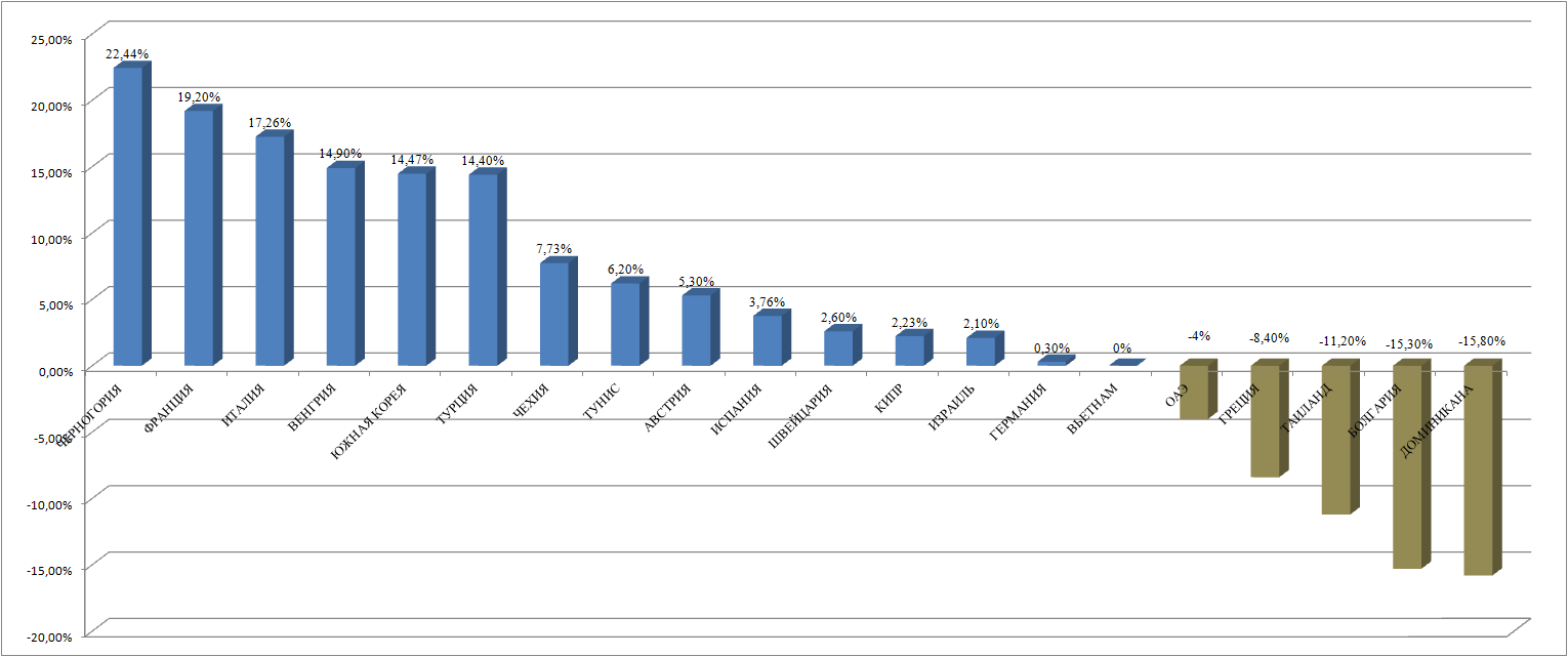 Рис. 2. Динамика выездного потока в январе-сентябре 2019 года по отношению к аналогичному периоду 2018 года, ТОП-20, %