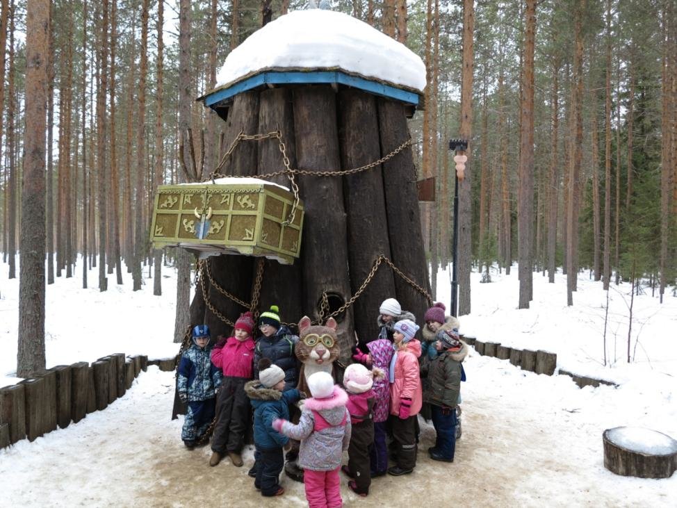 Идти по заснеженной Тропе сказок интересно и детям, и взрослым: тут и Домик Лесовичка Шишки, волшебный колодец, заколдованный мост, волшебный дуб, у которого можно набраться мудрости и костер Двенадцати Месяцев, где можно обогреться.