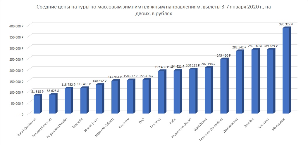 Аналитическая служба АТОР публикует итоги анализа средних и минимальных цен на пакетные туры* с вылетом 3-7 января 2020 года по 16 востребованным «зимним» пляжным направлениям: Индия (Гоа), ОАЭ, Турция, Израиль (Эйлат), Иордания (Акаба), Китай (Хайнань), Вьетнам, Таиланд, Шри-Ланка, Индонезия (Бали), Мальдивы, Куба, Доминикана, Мексика, Танзания (Занзибар), Бахрейн.