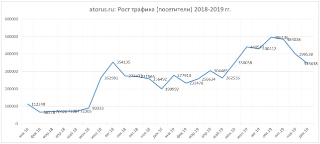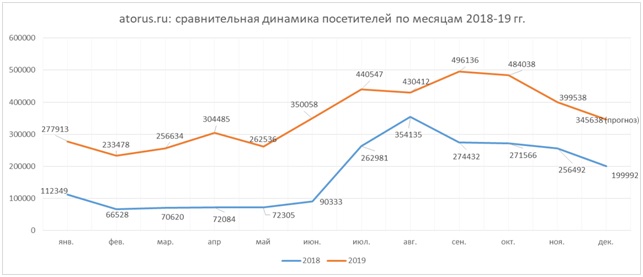 Таковы данные сервиса Яндекс.Метрика. Наибольшее количество уникальных посетителей было зафиксировано в сентябре 2019 года – почти 500 тысяч за месяц. Начиная с июня (начало высокого туристического сезона) показатель месячного количества уникальных посетителей на сайте не опускался ниже 350 тыс., эти цифры удается поддерживать и в зимнем сезоне.