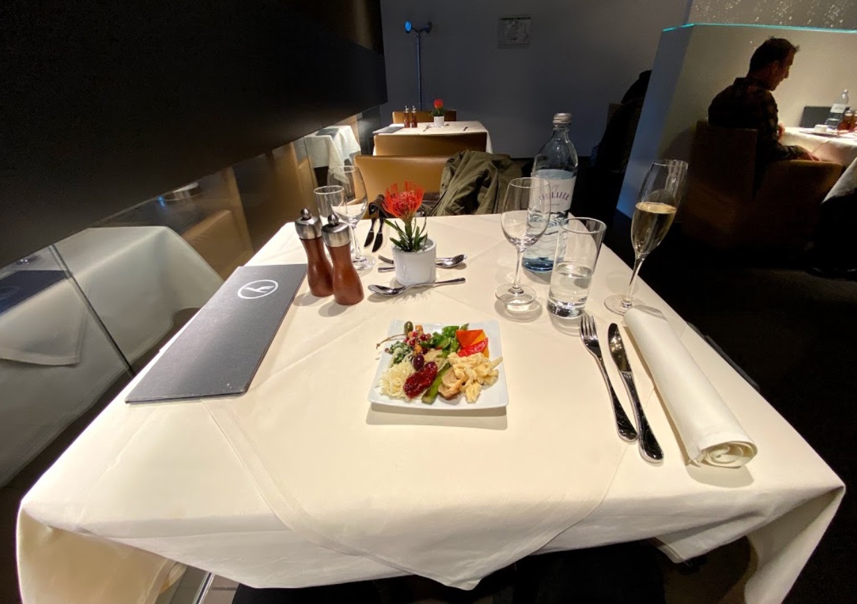 Ожидание в зале Lufthansa предполагает персонального помощника, который поможет каждому пассажиру с прохождением проверки службы безопасности и регистрацией, а также ресторан и бар с около 130 различными сортами виски, сигарный салон и множество мест для отдыха – от удобных кресел до полноценных офисных помещений.