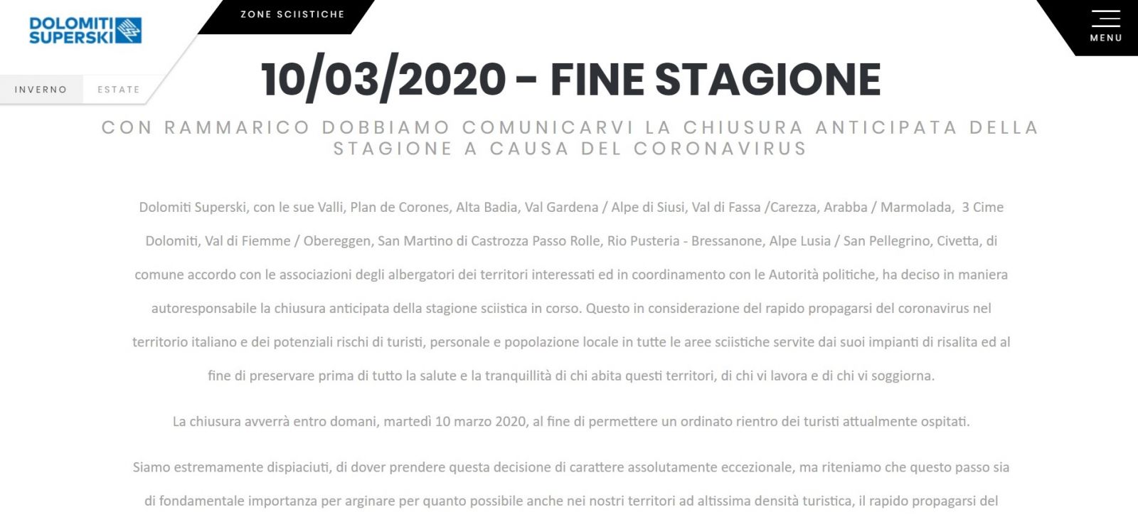 «Мы очень сожалеем, что вынуждены были принять это абсолютно исключительное решение. Но мы считаем, что этот шаг имеет принципиальное значение для того, чтобы остановить на наших территориях с очень высокой плотностью туристов быстрое распространение коронавируса», – говорится в заявлении Dolomiti Superski.