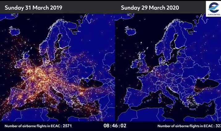 Трафик в марте 2020 года в небе над Европой оказался хуже, чем в марте 2010 года, когда происходило извержение вулкана Эйяфьядлайёкюдль в Исландии.