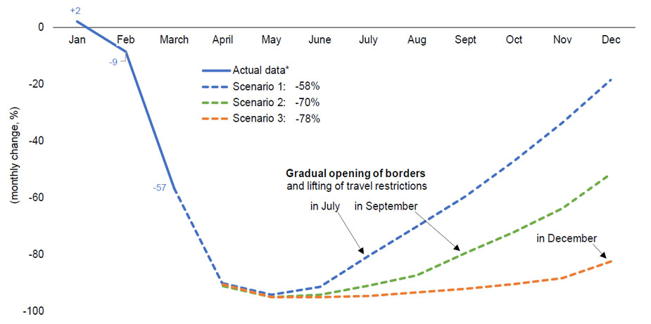 Согласно первому сценарию, в случае постепенного открытия границ стран и ослабления ограничений на поездки в начале июля, количество международных поездок по итогам 2020 года упадет относительно 2019 года на 58%.
