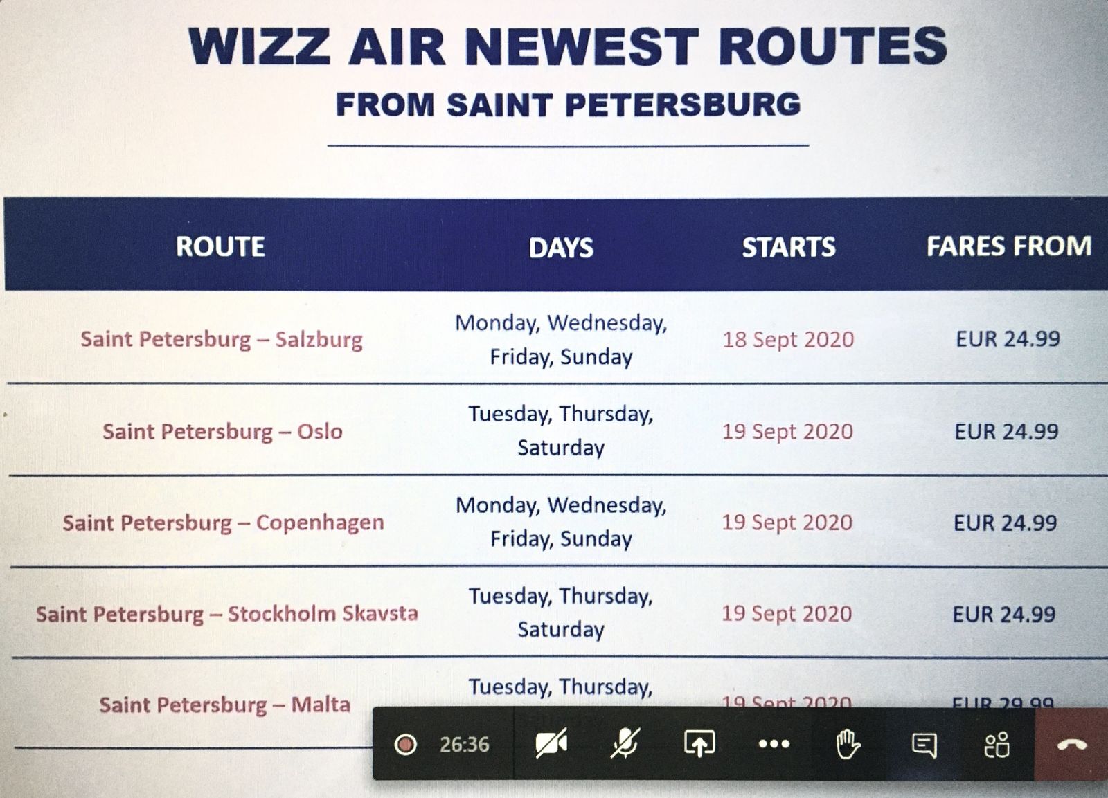 В планах Wizz Air был запуск этим летом из Санкт-Петербурга полетов в Братиславу, Бухарест, Вильнюс и Софию. Однако пандемия сдвинула сроки старта этих полетных программ. Как заявил г-н Варади, начало полетов зависит от сроков открытия границ России и других стран.