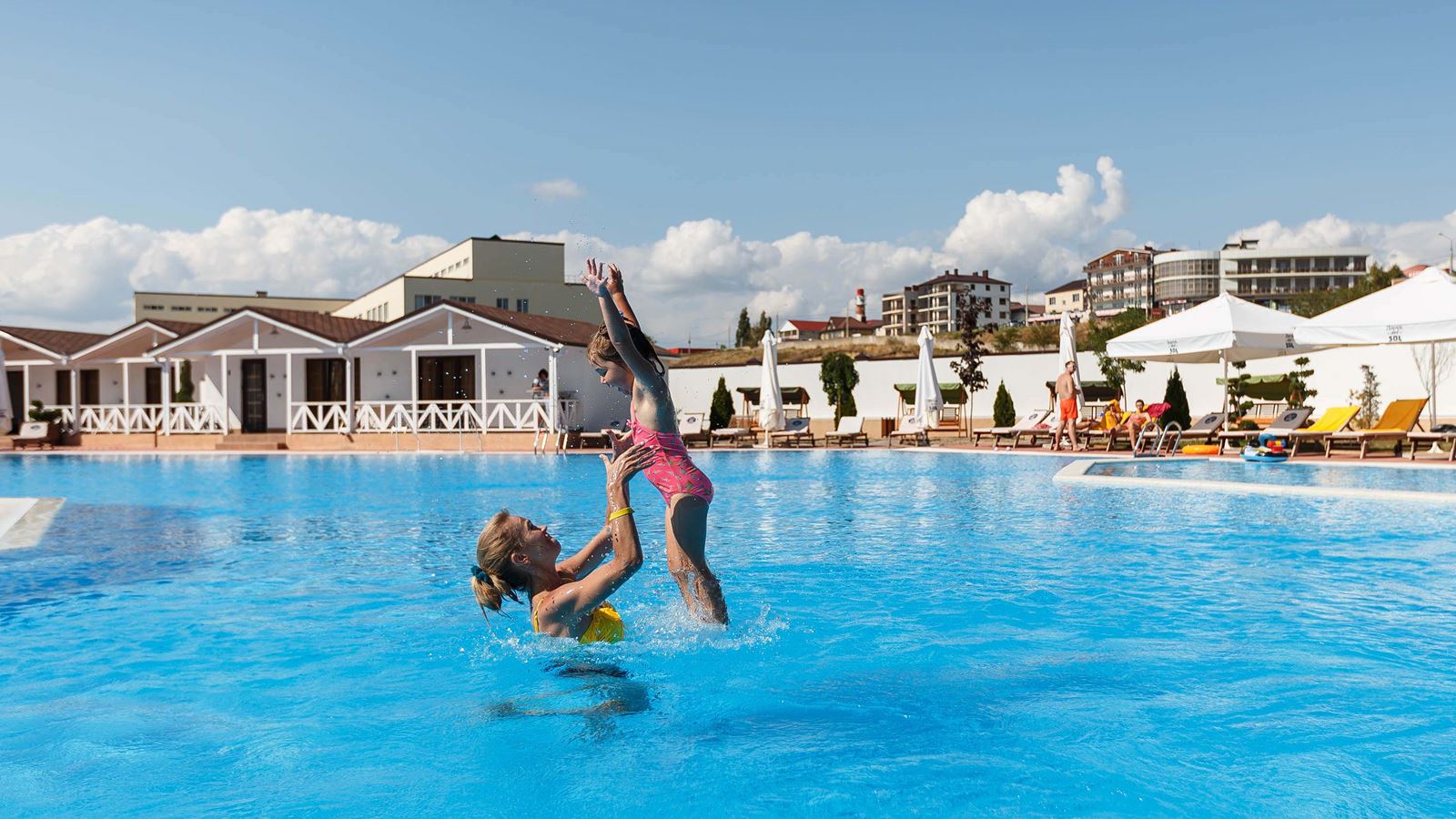 Это, прежде всего, комплекс подогреваемых бассейнов (2 открытых – взрослый с зоной джакузи и детский, с горкой, и крытый), откуда детей не вытащишь за уши (температура воды +28,5 С), и качественная анимация (работает детский клуб).