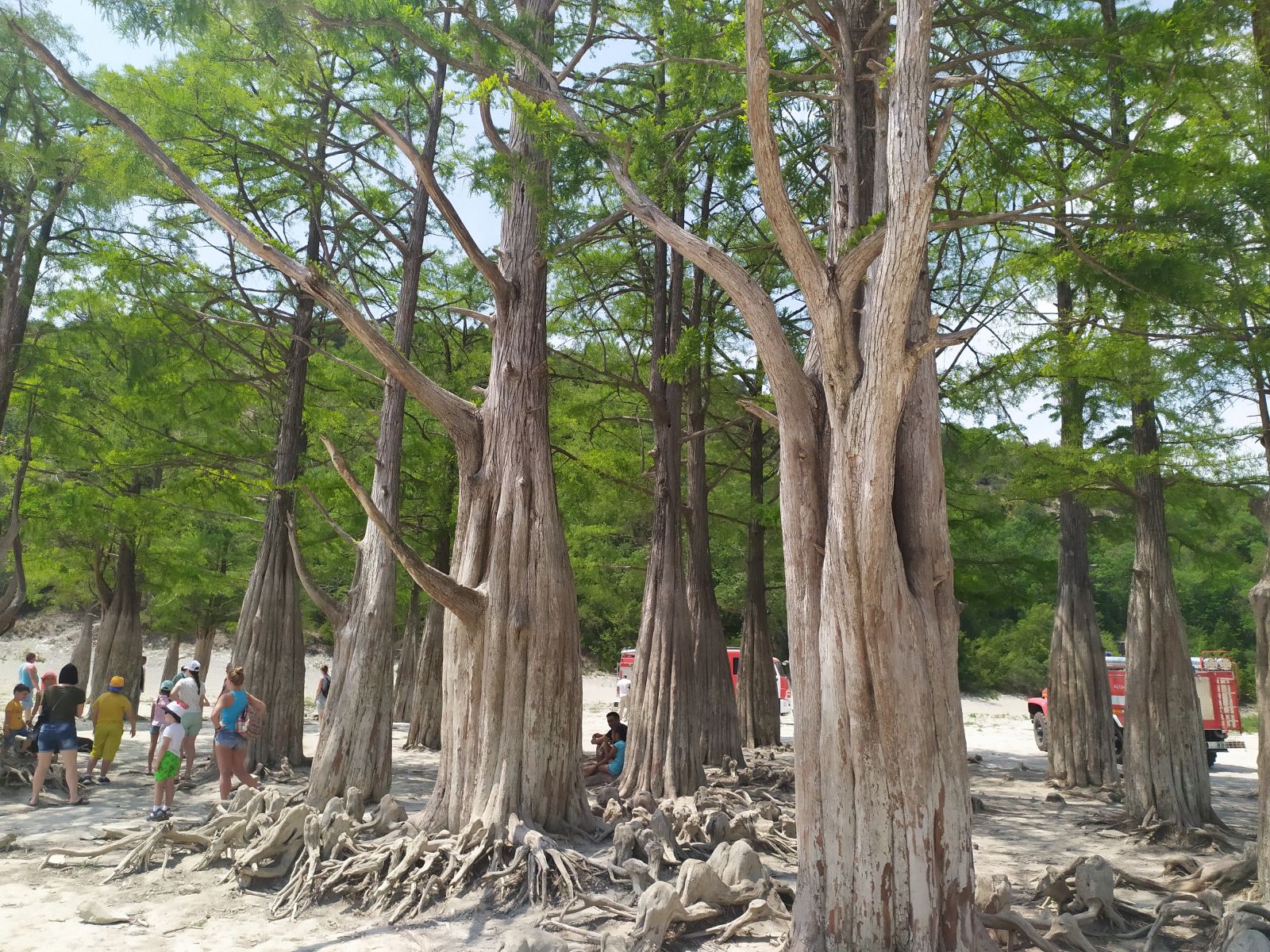 Иногда же (так было в конце июня этого года) уровень воды в озере понижается, и тогда до кипарисовой рощи можно дойти посуху и посидеть на огромных корнях. В такой жаркий период корни кипарисов поливают водой приезжающие пожарные машины.