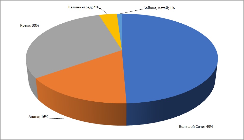 По данным «1001 тур», сейчас безусловным лидером по продажам туров по России является Большой Сочи – 49% всех продаж. Второе место у Крыма – 30% проданных туров, далее следует Анапа – 16%.