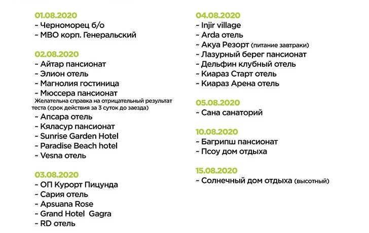 По данным туроператора ANEX Tour, до 15 августа в Абхазии откроется около 30 объектов размещения. График их открытия представлен ниже.