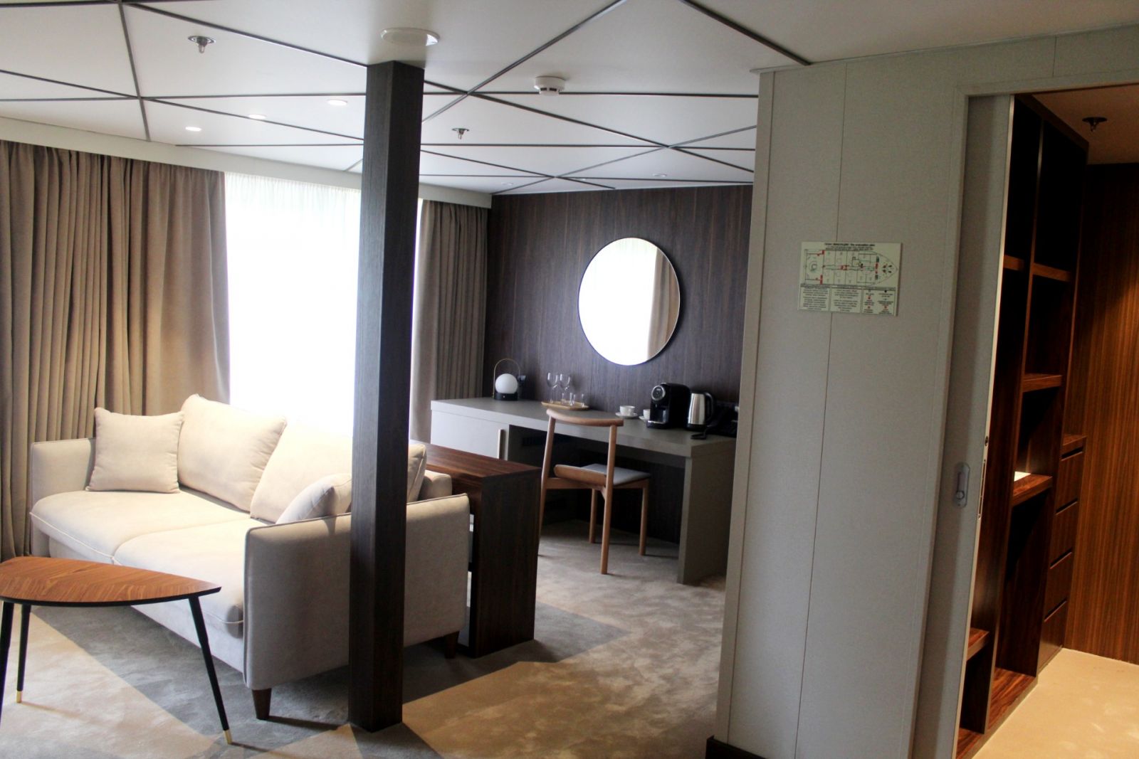 Оснащение всех кают примерно одинаковое – это сдвигающиеся одинарные или двухспальные кровати, мягкая зона с креслами и столиком для отдыха, зеркало с пуфиком, шкаф для одежды (в гранд-люксе это отдельная гардеробная). В каюте есть телевизор, холодильник, чайник и кофе-машина, индивидуальный кондиционер и судовое радио с несколькими программами.