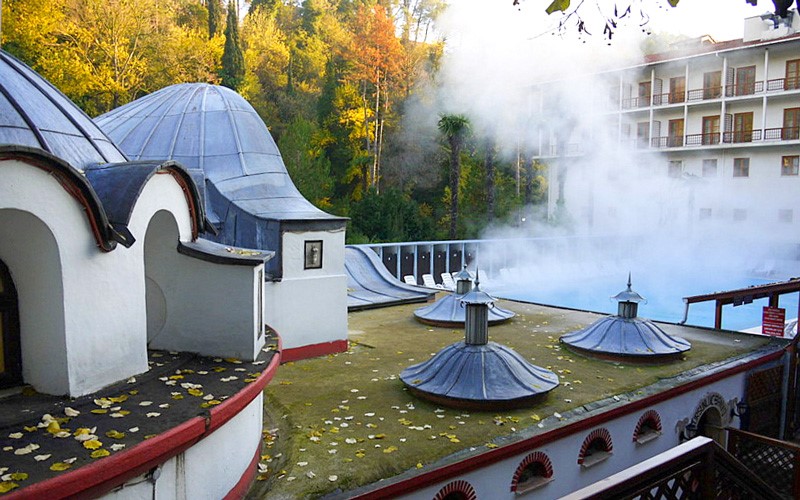 Совмещают традиционные для Турции посещение хамама и массаж с купанием в термальных водах. Один из бассейнов с термальной водой расположен прямо под открытым небом. А так как температура воды достигает 40 градусов, купаться здесь комфортно даже в холодное время года.