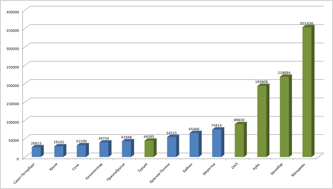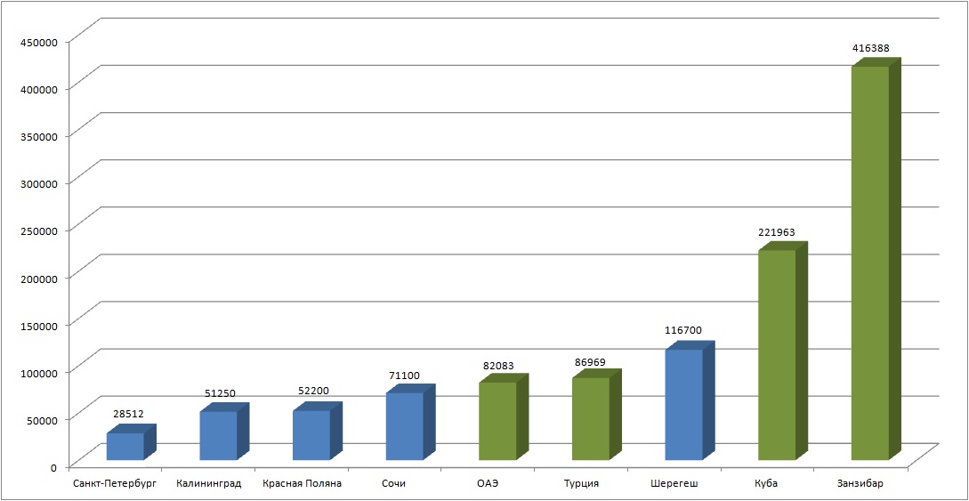 Минимальная стоимость недельных новогодних туров в отели 3* с вылетом 27 декабря (на Занзибар – 26 декабря) с покупкой в середине ноября представлена на рис. 1. Отметим, что для российских курортов цены брались на недельные туры на двоих в отелях 3* с завтраками, а для зарубежных исследовались цены на отели 3* с питанием «все включено».