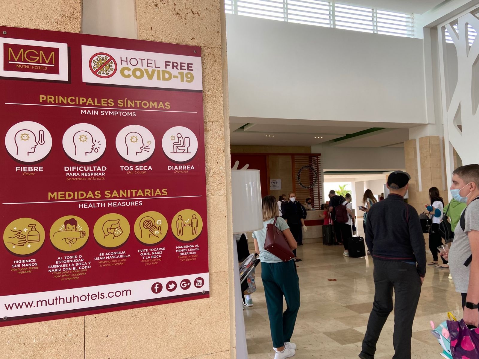 Кубинцы строго следуют протоколам безопасности: уже на въезде на территорию гостиницы колеса туристического автобуса обрабатывают дезинфицирующим раствором. При выходе из автобуса туристам проводят термометрию, обрабатывают руки санитайзером.