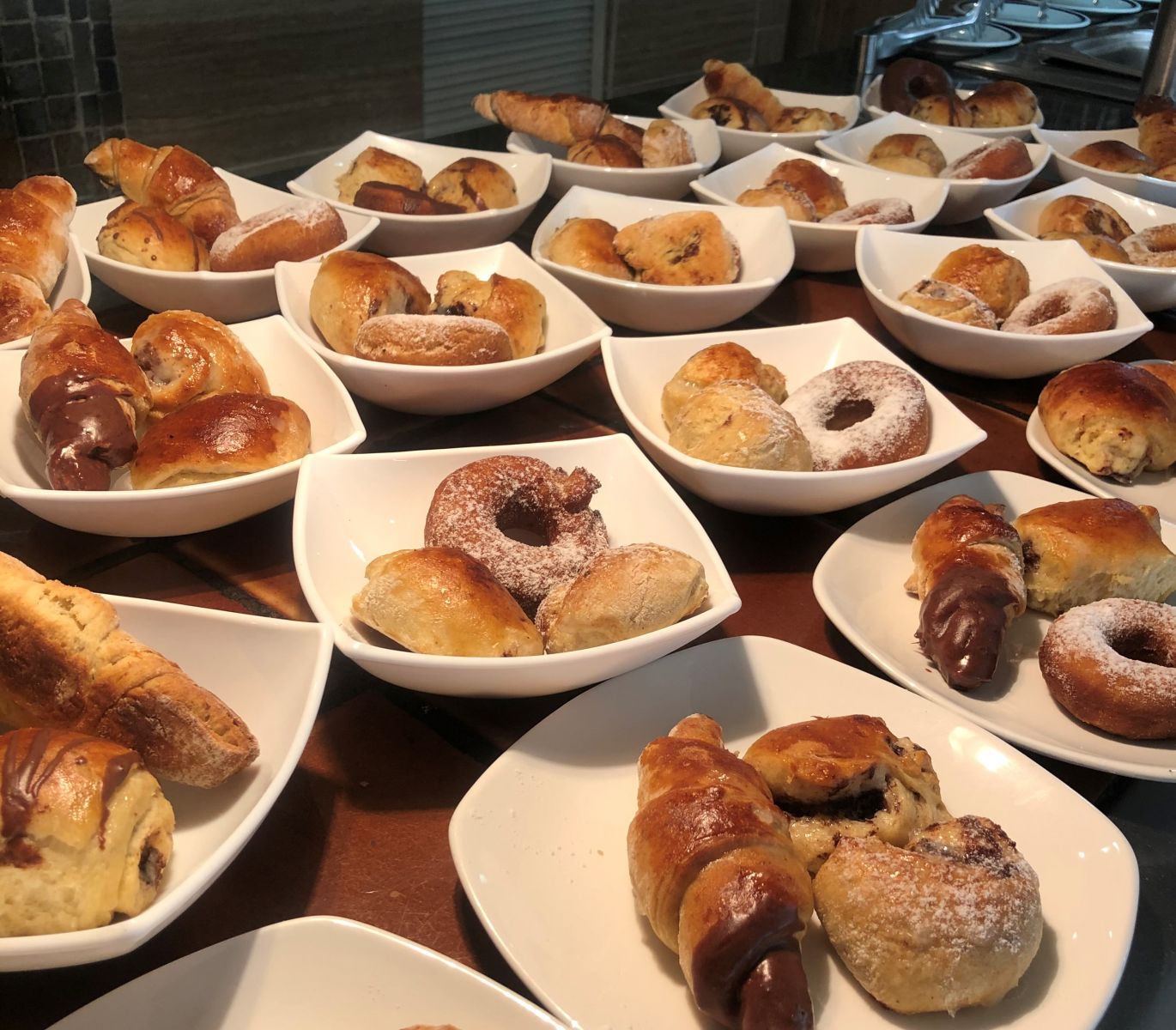 Самим можно взять лишь порционные закуски (оливки, сыр, хамон, колбаса, рыба, соусы и пр.), выпечку (она также уже «расфасована» по тарелочкам), хлеб (тосты можно пожарить), небольшие десерты и порции фруктов.
