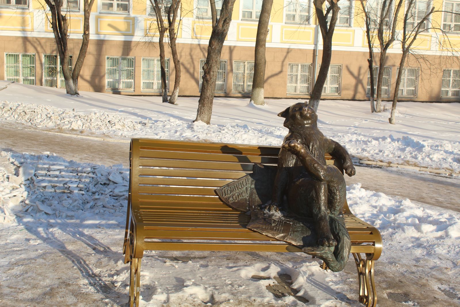 Символ столицы Йошкар-Олы – Йошкин кот, вальяжно сидит на скамейке в сквере у университета: