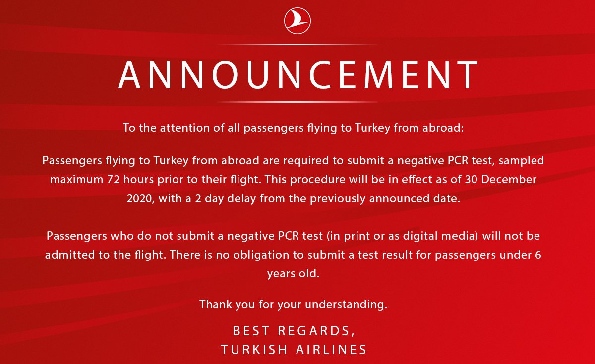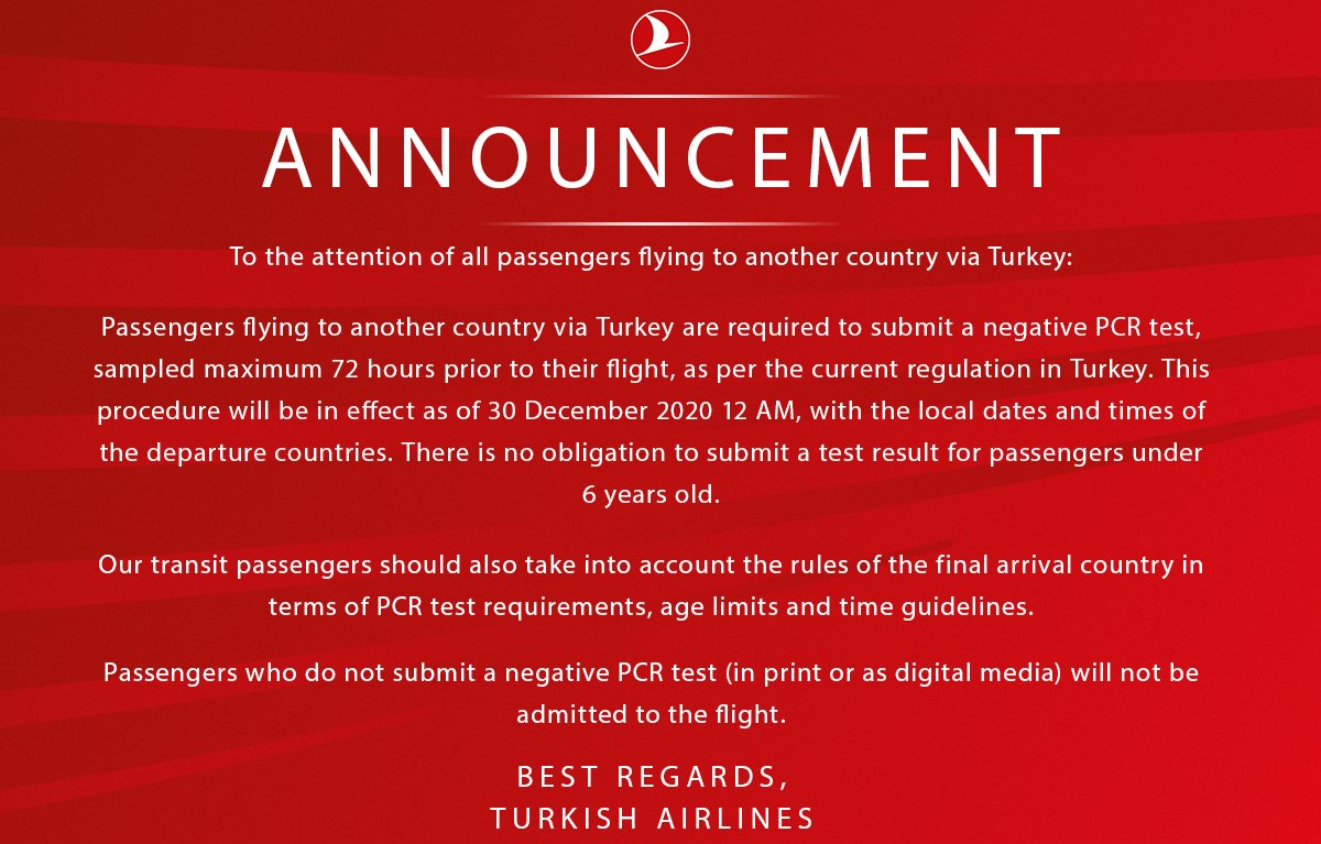 Update: вечером 30 декабря турецкие авиационные власти в третий раз поменяли свою позицию: тест для пассажиров, следующих в другие страны, нужен только для властей страны прибытия, в Турции при пересадке его не требуют, и не будут требовать у транзитных пассажиров при посадке. Хотя днем ранее на сайте Turkish Airlines висело вот такое объявление: