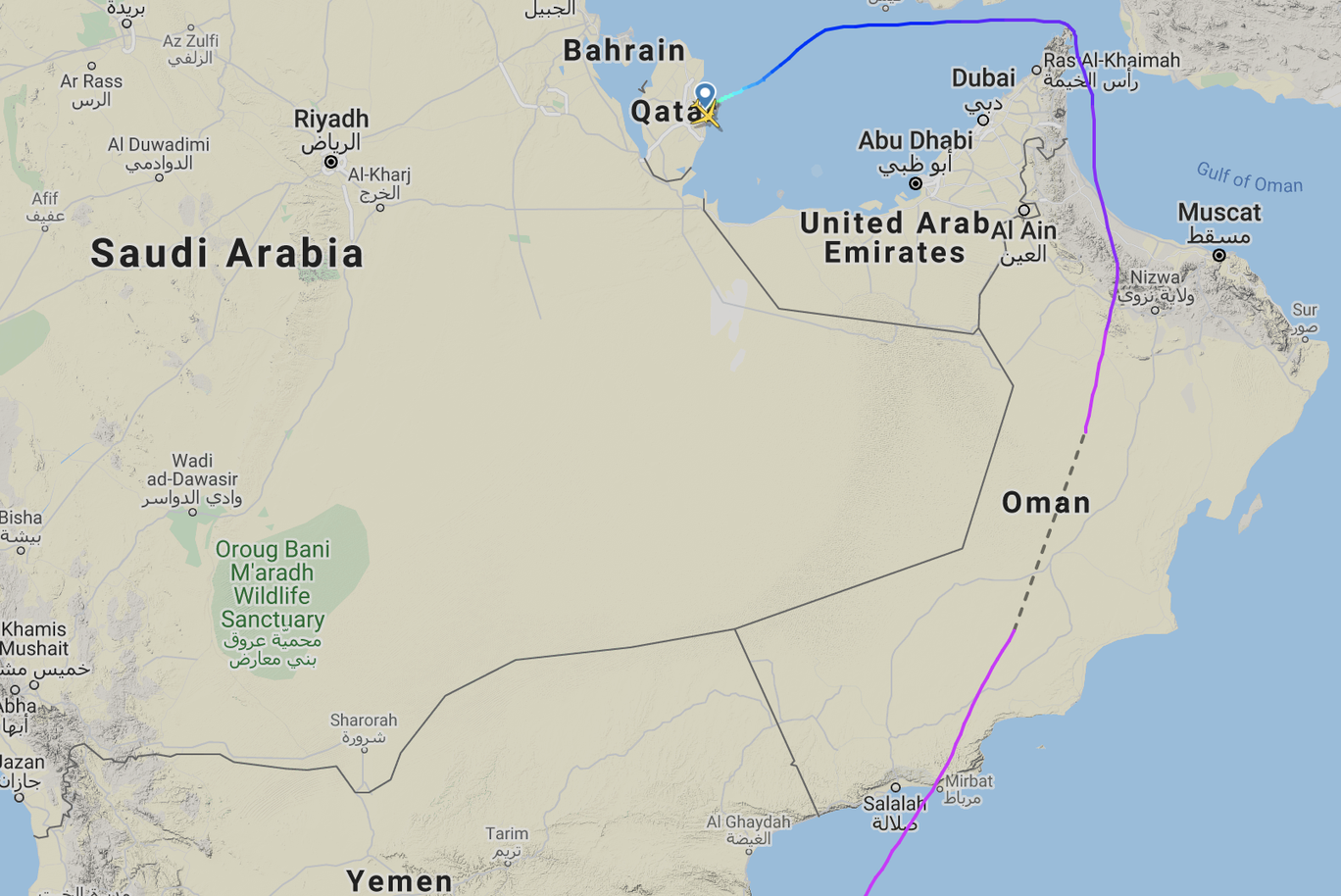 Так, рейс из Дохи в Йоханнесбург (направление к юго-западу от Катара) начинался с полета на северо-восток в сторону Ирана (чтобы избежать пролета над Саудовской Аравии), затем самолет поворачивал на восток для облета воздушного пространства ОАЭ, и только после этого ложился на курс в сторону ЮАР.