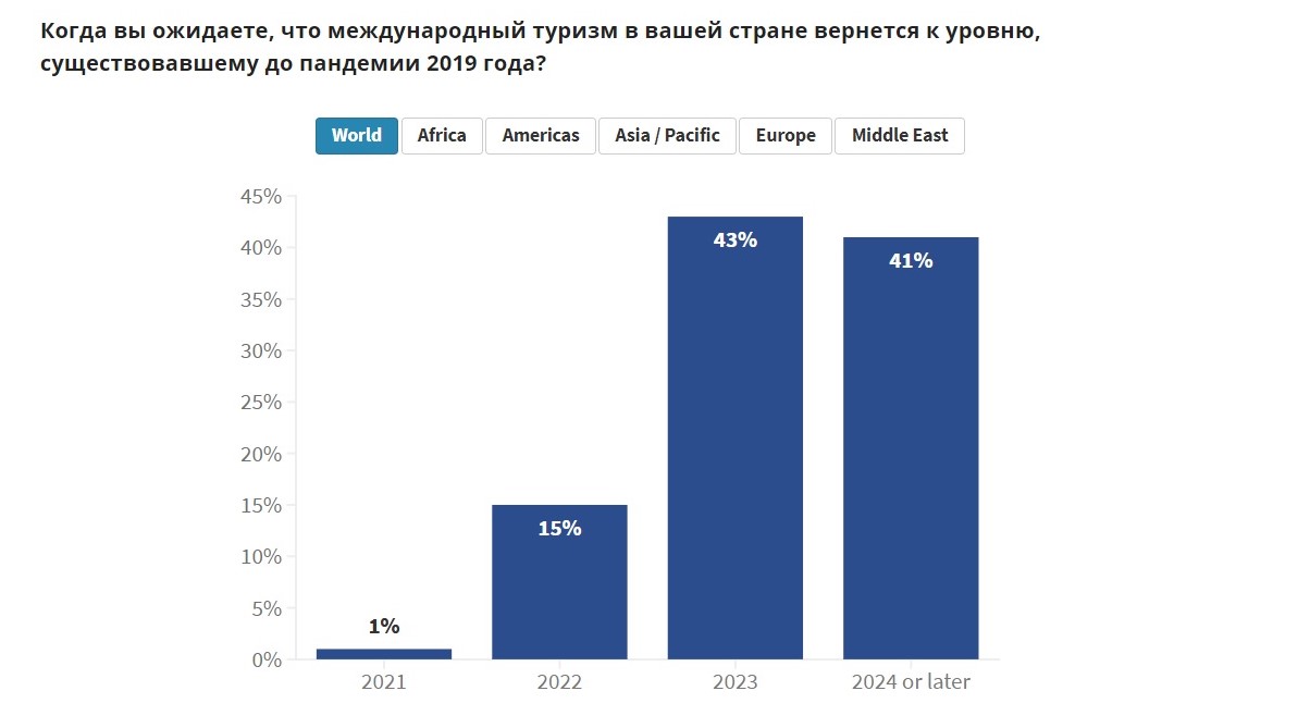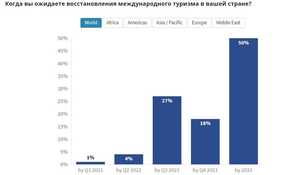 По оценкам экспертов, общие перспективы восстановления экономики в 2021 году ухудшились. В результате половина из них ожидают, что восстановление туристического сектора произойдет только в 2022 году, тогда как в октябре 2020 года таких был лишь 21%.