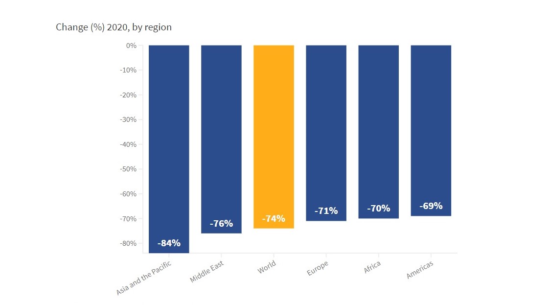 По данным UNWTO, сильнее всех от пандемии пострадал туризм в Азиатско-Тихоокеанском регионе, где действуют максимально строгие ограничения на поездки. В этом регионе количество международных прибытий упал на 84% (300 млн.). На Ближнем Востоке и в Африке отмечен спад на 75%.