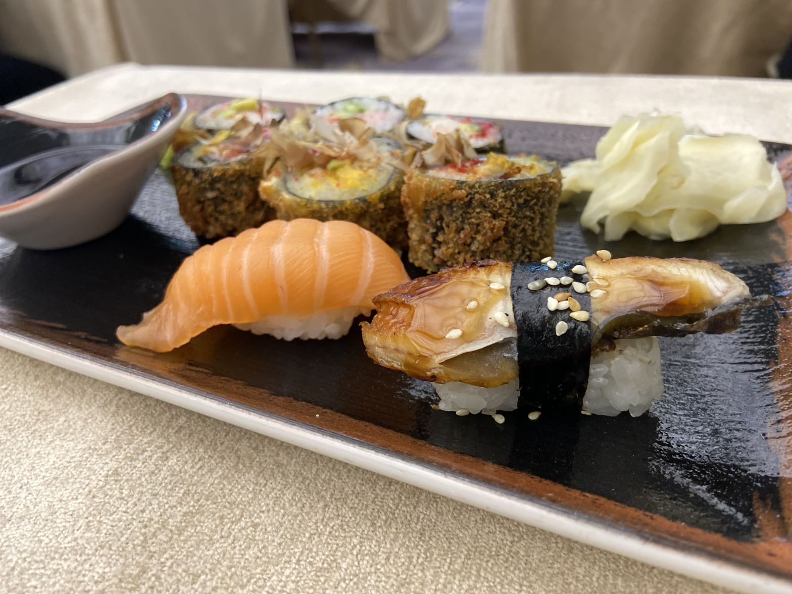 Каждому гостю вручили фирменную маску и пакет с информационными материалами. Все приглашенные были рассажены по одному за столики: вместо привычного допандемийного буфета всех ждала персональная подача японских блюд и десертов.