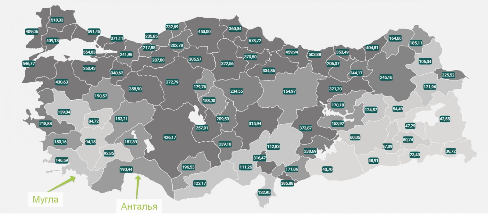 В провинции Мугла (Эгейское побережье) 146 случаев на 100 тыс. населения. В провинции проживают 1, 1 млн человек. Это означает, что в неделю здесь выявляют еще меньше - 1606 носителей вируса.