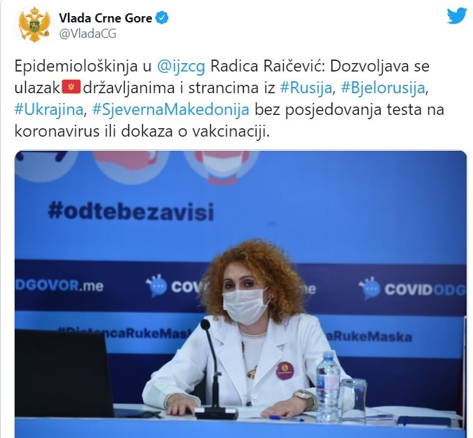 С 24 апреля гражданам Черногории и иностранцам из России, Беларуси, Украины и Северной Македонии разрешается въезд без ПЦР-теста на коронавирус, положительного серологического теста (антитела IgG) или доказательства того, что они были вакцинированы от COVID-19.