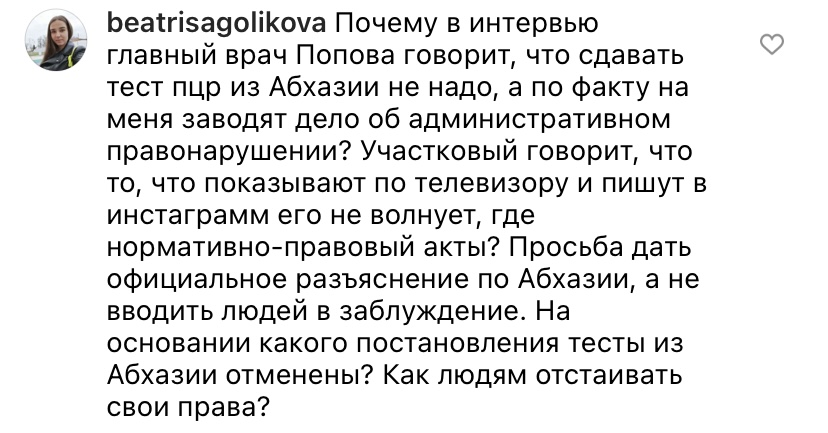 Многие люди пишут, что опасаются штрафов за не предоставление ПЦР-тестов по возвращении из Абхазии от региональных управлений Роспотребнадзора, и, чтобы обжаловать эти санкции, им нужны официальные источники, а не соцсети.
