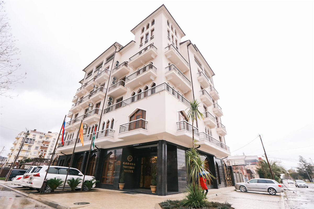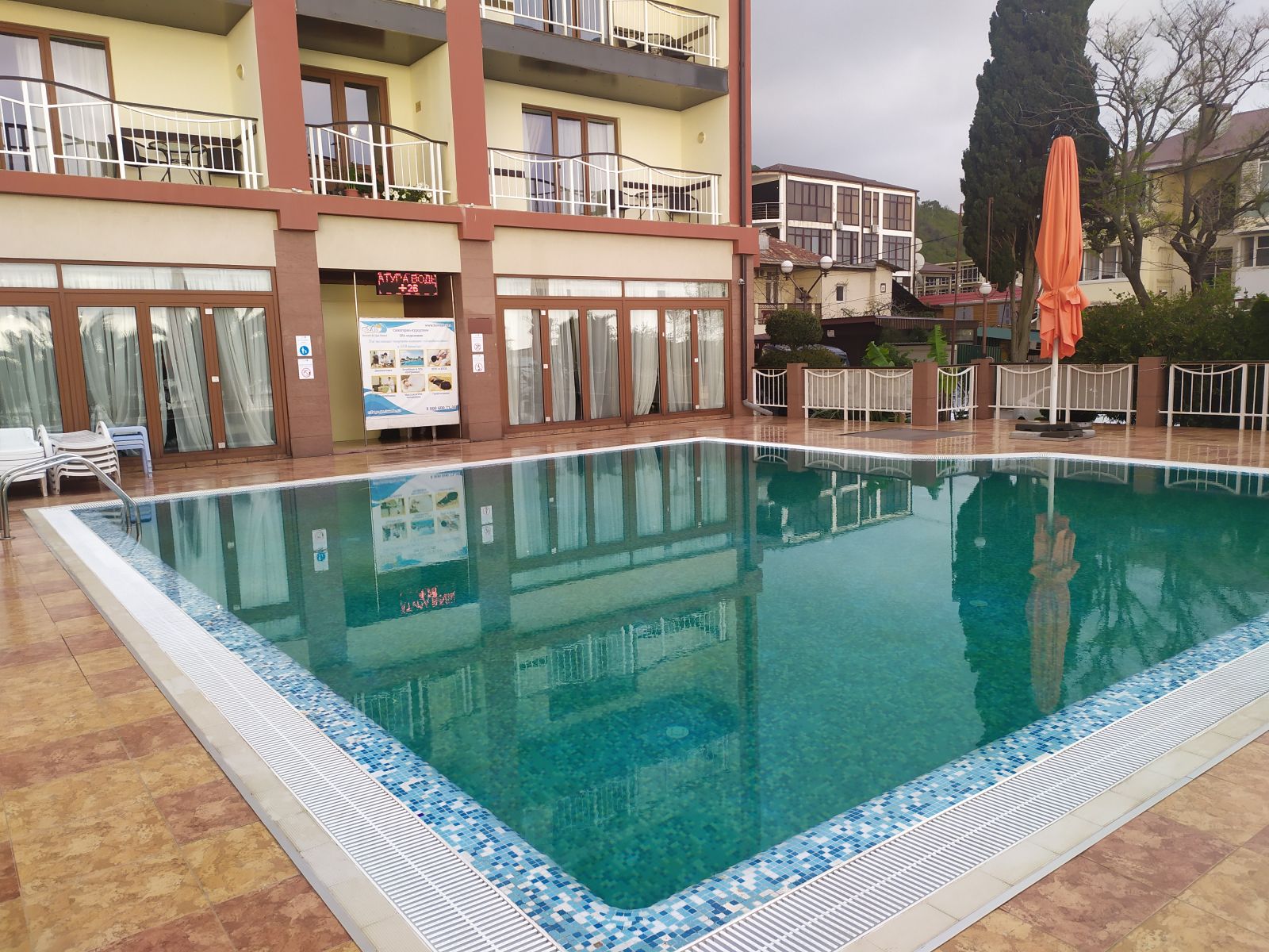 Есть собственный круглогодично подогреваемый бассейн (что важно в межсезонье). Летом удобно, что для туристов в «Гаруде» организован регулярный бесплатный трансфер на два закрытых частных песчаных пляжа Сухума («Моко» и «Дель Маре»).