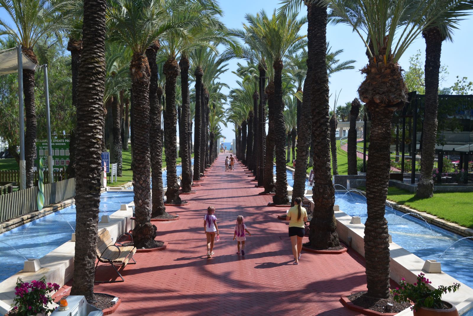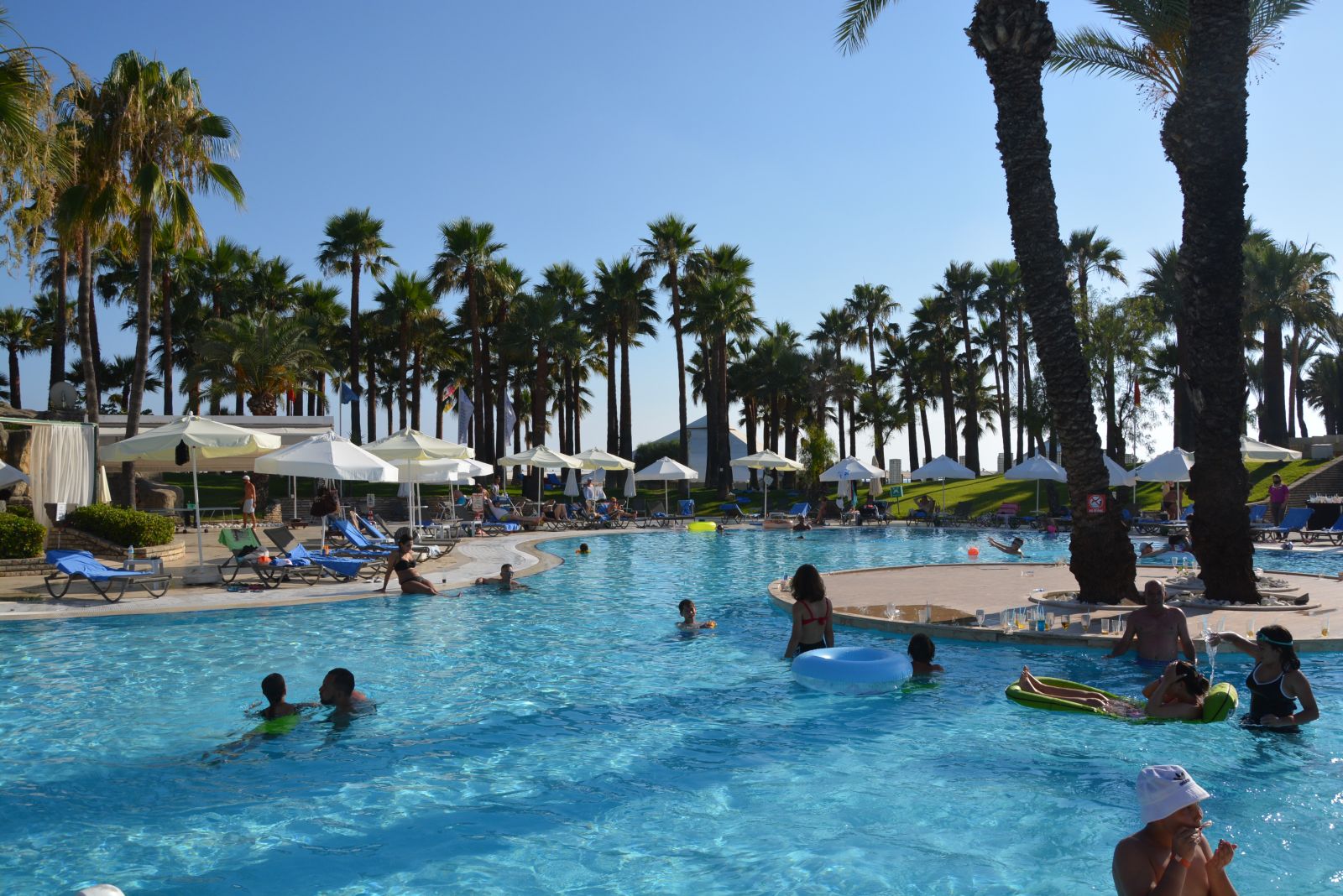 Слева от центральной (и очень красивой) аллеи, окаймленной фонтанами, расположен огромный общий бассейн, глубиной 1,6 м. Характерно, что несмотря на высокую загрузку (90% в июле) свободные шезлонги около него всегда можно найти: персонал следит за этим, так же как и за тем, чтобы приносить из бара желающим прохладительные напитки (это делают, как во многих премиальных отелях, официанты на роликах).