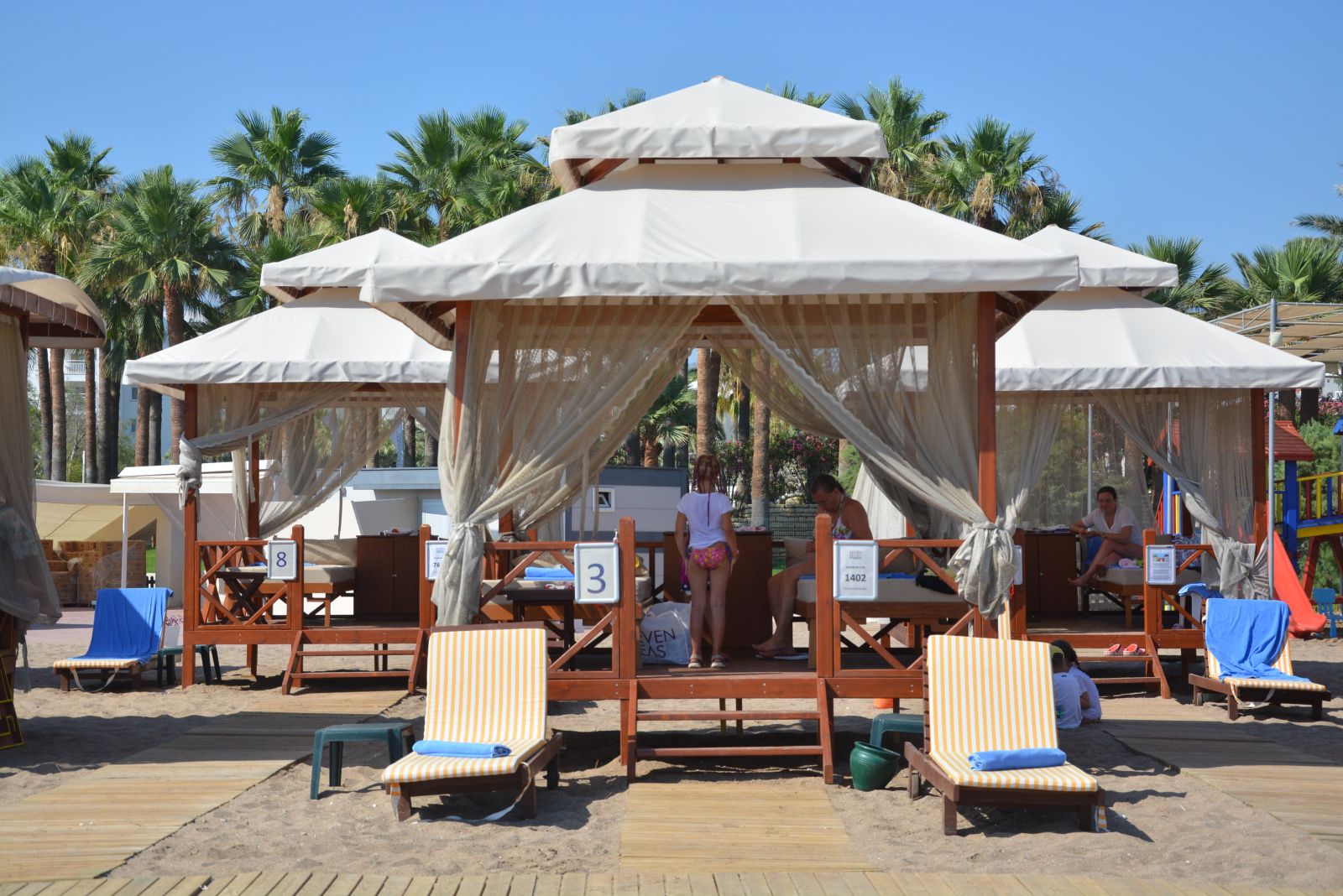 Семьям в Seven Seas Hotel Blue 5* сразу советуем забронировать газебо (павильон) на пляже хотя бы на сутки. Цены – это просто какое-то удивление. Павильон с двумя кроватями, шезлонгом, шкафчиком, мини-баром и столиком стоит 15 евро в сутки (это без сервиса официанта).